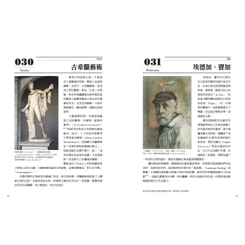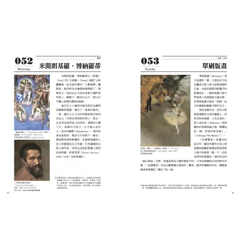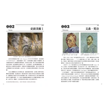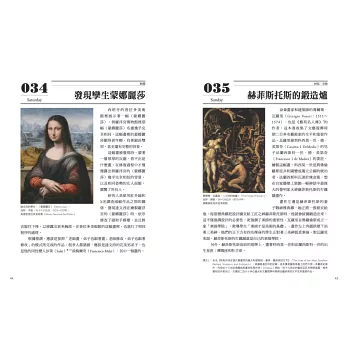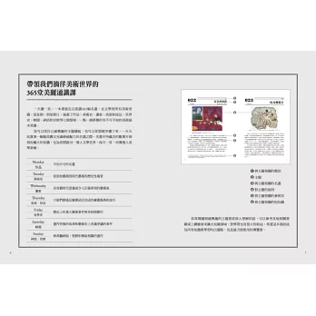 一天一頁,一本書就可認識365幅名畫,並且學到所有美術常識。從星期一到星期日,涵蓋了作品、美術史、畫家、流派和技法、世界史、軼聞、神話和宗教等七個領域,一點一滴累積所有不可不知的美術基本常識。 您可以從自己感興趣的主題讀起,也可以從頭循序讀下來,一天天 欣賞著一幅幅美麗又充滿神祕魅力的名畫之際,名畫中所蘊含的數萬年深 刻而龐大的知識,也為您開啟另一個人文學世界。每天一頁,培養個人美學素養。