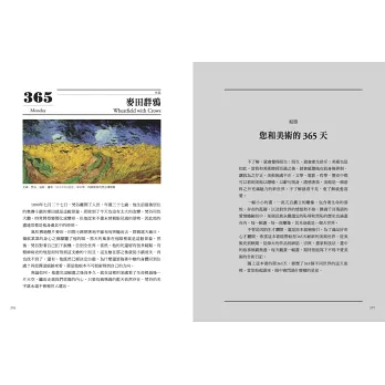 不管是因陌生才翻開,還是原本就被吸引,為了滿足好奇 心才翻開,希望這本書能帶給您365天嶄新的美術世界。從美 術史到軼聞,從偉大的作品到神話和宗教、畫家和技法,畫中的故事無窮無盡。每天觀賞一幅畫,期待您能寫下不得不愛美 術的全新日記。