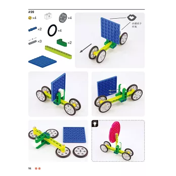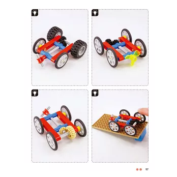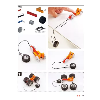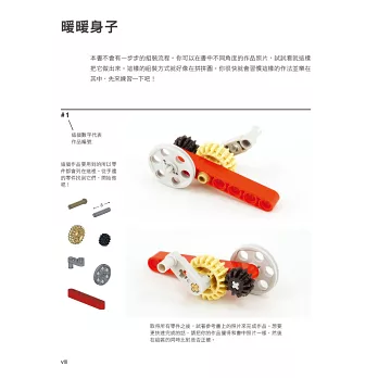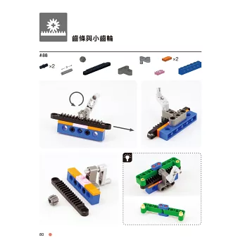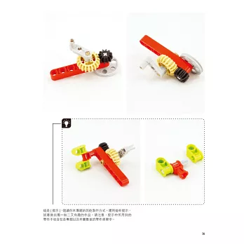 本書精選了141個無須馬達的可愛小裝置,讓您可以親自製作與把玩。每個專題都有不同角度的彩色照片,並標示了所需的樂高科技系列零件幫助您順利完成。各個作品都包含了某種簡易機構,從齒輪的動力與轉動,一直到能自行移動的小車來呈現各種線性、擺動、旋轉與往復式的動作。