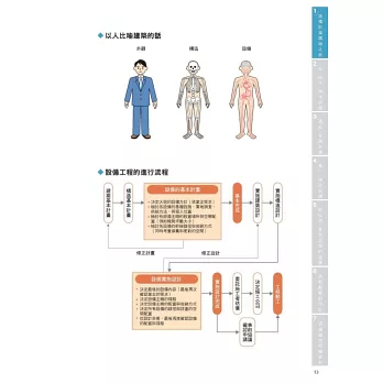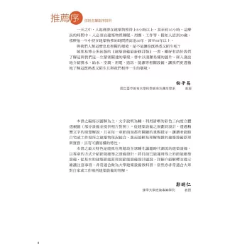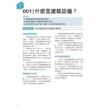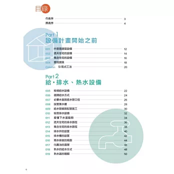 本書從理解建築設備的基礎開始,從使用的需求切入探討各種設備與建築整體的相應性,以漸進式、豐富的圖解與計畫施作要點,有系統地引領進入實際的規畫當中。舉凡生活用水的引入、排放;空調及通風系統的冷、暖氣與氣密性;以及驅動各種設備運作的電力系統、還有符合時代潮流的節能設備,涵括生活所需的細項,深度剖析,完整介紹。