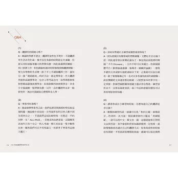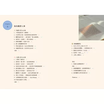 3. 各章節末整理出對「翻譯」的常見疑問,舉凡如何入行、被拖欠稿費時怎麼處理、自主練習時,怎麼知道自己的翻譯是否正確等等,提供讀者實用的建議。