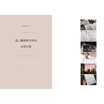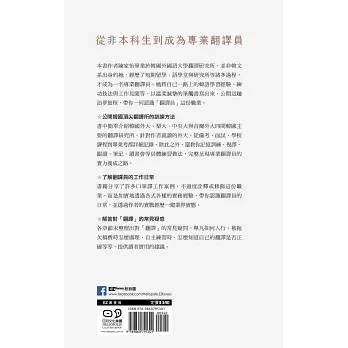 書中從家怡第一次接觸韓語的感受,到準備翻譯研究所入學考試的過程,一直到在校生活和韓國翻譯研究所課程分享,並談到一些自身工作經歷,最後撰寫成一本既實用又吸引人的書籍。在書中,她以誠摯的筆觸,將學習過程中的甜、酸、苦、辣娓娓道來,還坦率地談到譯者面對自動翻譯的心態。書中描述了韓語學習與翻譯訓練的精彩片段,同時帶讀者深入了解翻譯領域的諸多問題與現象,我相信這本書一定能成為韓語翻譯學習的最佳參考書,也期待讀者們開闢出屬於自己的翻譯新天地!──金珍我(韓國外國語大學翻譯研究所韓中系系主任)