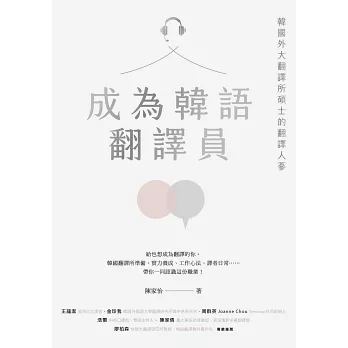 作者從國內英文系轉戰韓國翻譯研究所,歷經挫折、最終躋身國際會議口譯員的行列,其追求「非我不可」的人生故事,令人動容。書中也分享了韓外大翻譯所的嚴格訓練過程,以及在台韓業界接案的實務歷練,可說是國人赴韓國攻讀翻譯、成為中韓譯者的最佳指南。──廖柏森(台師大翻譯研究所教授、暢銷翻譯教科書作者)