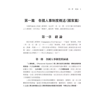 本書以論述英、美、法、德、日與中國大陸等六國的人事制度為主。全書分為「國家篇」與「制度篇」分別論說。內容取材橫跨10年,尤重近來各國之法制改革資料的比較分析。兼顧學理與制度比較之探討,為本書特出之處。