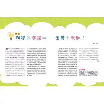 科學,是多少人的痛。 欣見《科學閱讀素養》問世,匯整了生動有趣的科學素材與延伸思考的學習單,相信在師長適當的運用及引領下,可望能消弭學子對科學的驚恐,進而培育出更具科學素養的理性社會。