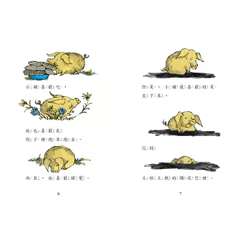 阿諾.羅北兒的文字被公認屬於「極簡主義」,這一系列作品原文用字不難,出現的句型也都是最常用的,因此非常適合當成學習英文的閱讀素材。故事有長有短,有較輕鬆也有較複雜的概念,文法難度也有深有淺,適讀年齡層從學齡到成人,彈性很大。閱讀重在理解,只要會字母拼讀的孩子就能練習獨立閱讀,因為有圖像輔助,加上故事有情境和因果關係,不需要多解釋文法,孩子也能讀懂故事的內容。有文法概念的讀者,透過閱讀故事實際體會英文的用法,比起看教科書有趣多了!像是在《小豬離家記》中,當小豬跳進人行道的水泥裡,瞪大眼睛一臉狐疑地說:“It’s not very soft at all. In fact, it is getting harder and harder.” 二個句子就包含了好幾個英文課上背過的片語和句型。接下來:“He tries to get up, but he cannot move. Soon a few people stop to stare at the small pig. More and more people come to see the small pig. Then many, many people come to look because they have never seen a pig stuck in the sidewalk. ”簡潔精確的文字,搭配上生動的插畫,大小讀者都知道發生了什麼事。