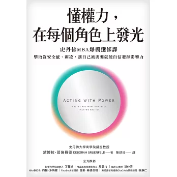 在善用權力演好自身角色時,並沒有所謂的對錯可言。我們都可以學習如何依據環境、關係動態和我們想帶上舞台的情緒,來調整自己的表現。這本精彩著作會告訴我們怎麼做。——蘇珊.大衛(Susan David),哈佛醫學院心理學家,《情緒靈敏力》作者