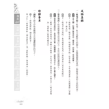 本書的每一篇文言文均先從原文、註釋、翻譯等單元著手,幫助讀者掌握基本知識和考試內容,再輔以修辭薈萃,詳細剖析文章內的各種修辭、章法、句式和體裁,深入淺出地引導讀者從古文中學習國寫技巧,並且提供課外的例句閱讀與說明,以利舉一反三。除此之外,還提供各篇章的國學常識,在閱讀文學作品的同時,更增進讀者的文學涵養,在考場上得以實際應用。另外,豐富的考古題與編者自編的試題演練,則讓讀者馬上驗收學習成果,事倍功半。最後,更旁徵博引與該篇有關的歷史背景、人物簡介、延伸閱讀等相關知識,讓你不僅僅讀完關鍵十五篇文言文,更加深加廣自己的國學資料庫。