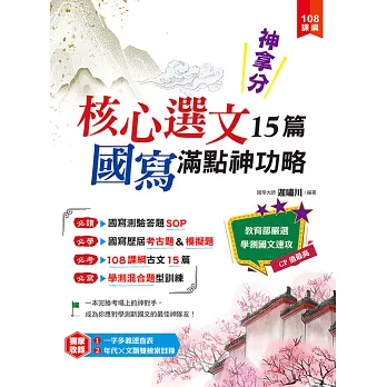是故,編者根據現階段教育現場的學習與教學需求,完整輯錄教育部最新頒定的十五篇推薦選文,包含《鹿港乘桴記》、《畫菊自序》等最新關鍵篇章,並且收錄國學常識、修辭薈萃、軼聞典故等單元,兼顧古文研讀的深度與廣度。更精心編寫國寫測驗說明以及國寫SOP,讓考生們能輕鬆應對來勢洶洶的國寫試題。最後,收錄混合題型訓練&歷屆考古題,讓學子們能一次掌握最新考情趨勢。