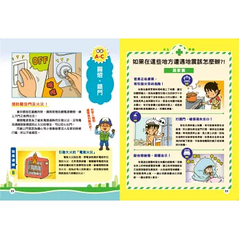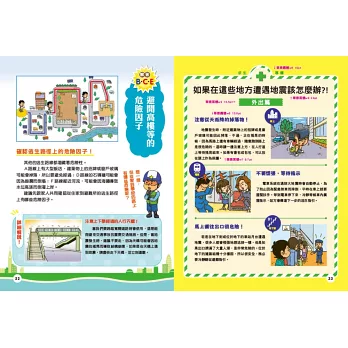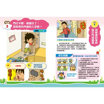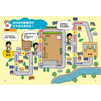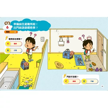 猶如身歷其境的漫畫情節,帶著小讀者跟隨主角一起逃生,一同思考下一步該如何抉擇,才能順利脫離險境。每個題目皆有難度星級,增加讀玩趣味性,並附詳細的解答與說明,帶領孩子釐清各種常見的防災迷思,把握求救時間,提高生存機會!