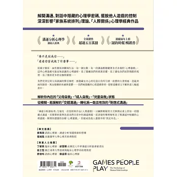 《人間遊戲》是溝通分析學派創始者艾瑞克‧伯恩的著作,也曾榮登《紐約時報》(The New York Times)暢銷書榜首達兩年以上,可見其受歡迎的程度。但是我也注意到本地坊間缺乏完整的中譯本,直到審閱期間必須中英對照精讀時,才發現內容的確有些深奧難懂,所以很佩服翻譯者功力不淺、詳實表述,並加上副標題,幫助讀者容易閱讀。此外,因原作者是精神科醫師,較深入的解剖心理遊戲溝通,且部分情節會探索到當事人的潛意識,因此讀者需要有些抽象理解的預備。