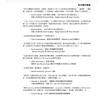 「《深入淺出設計模式》結合有趣、令人捧腹大笑的元素、深刻的見解和技術,以及實用建議,是一本有趣且引人深思的讀物。」 —Richard Helm 《Design Patterns》作者之一