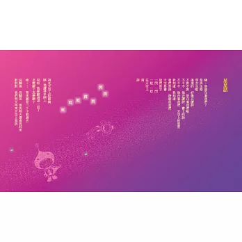 在這本詩集裡,讓人有一種驚奇的喜悅和感動:這麼可愛的一冊童詩集,竟能將現代的極簡,古典的繁複,天衣無縫的統合於一體。絹印版畫的效果;抽像普普的變形;電影廣告設計般的亮眼;兒童畫塗鴉的情趣…..整體風格細緻、清雅,不正符合了詩的氣質嗎?神秘,耐人尋味,真是美啊……..