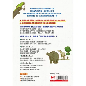 「我們會看到動物們為適應地球的氣候與環境所歷經的演化,有些動物與過去的樣貌早已大不相同,而有些動物卻又千萬年不變,樣貌始終如一,有些明明是近親,卻有極大的差異,有些動物竟然還和人類有相同的習性?這是一本圖文並茂又有趣的科普百科,趕快打開圖鑑, 會有更多驚人的大發現在等著你喔!」──滾媽,滾妹‧這一家版主