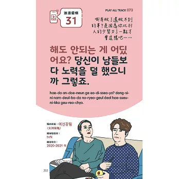 本書主要是為了學習韓語的一般讀者,以及熱愛追劇、略懂基礎韓語的讀者所撰寫。其實我很鼓勵讀者們透過電視劇學習韓語,因爲可以接觸到書本以外、現實生活常見的詞彙、句型,或時下流行的用語。但是韓語中許多句型表現如果任意使用,很可能會詞不達意,甚至可能會失禮得罪人。因此,我希望本書能幫助讀者們,在學習電視劇裡的「Real 韓語」的同時,也能夠學到韓語的基本文法、特殊用法和使用限制等。增加運用韓語的能力與減少失誤。