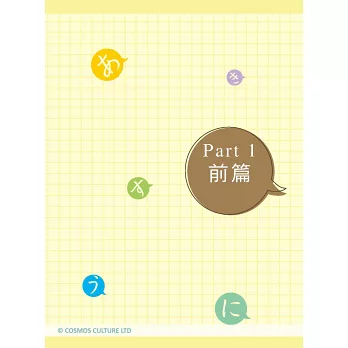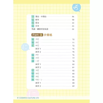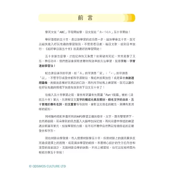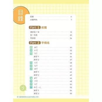 主要結構分成四個Part:包括Part 1前篇的〈淺說五十音〉、Part 2平假名、Part 3片假名,以及Part 4進階篇的〈旅遊日文小句〉以及〈心理測驗〉等。