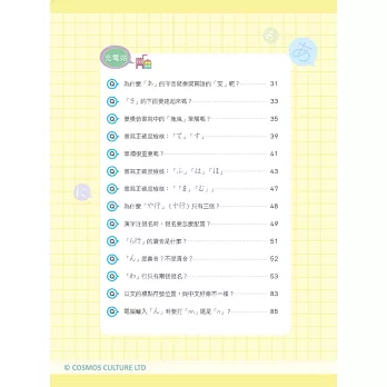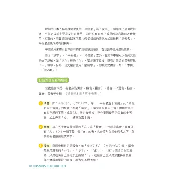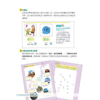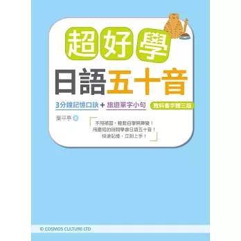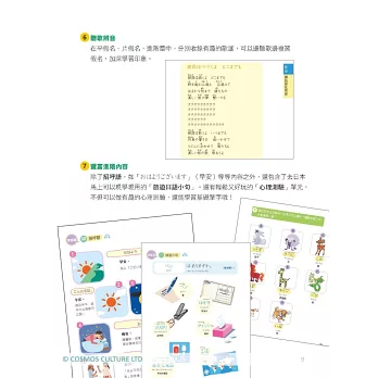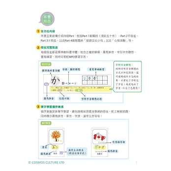 平假名、片假名的單字均標示羅馬拼音及重音。平假名加附漢字注音標示;片假名加附外來語字源等內容,並搭配輕鬆插圖更容易記憶。