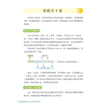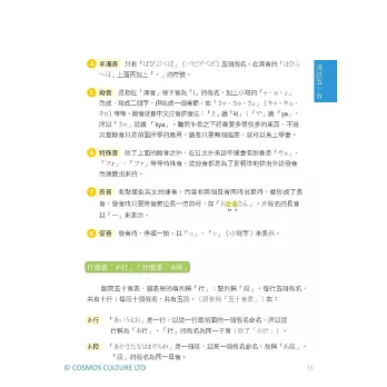 在假名之間穿插補充五十音的小知識,如:日語的手寫字體與印刷字體的不同、五十音是否真的有五十個音等內容,宛如有位虛擬的日文老師在旁教導。