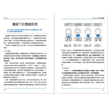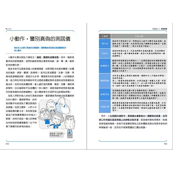 本書除了教你從五官表情,特別是眼睛,還有行為舉止、生活習慣小動作、穿著打扮喜好興趣等特點來觀察對方的性格和內心想法,還教你怎麼連貫性配合環境去解讀他人無意間傳播的真實意涵,行為心理學推測對象物行為背後的動機與暗藏的訊息,讓你在社交應酬時能夠無往不利。