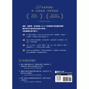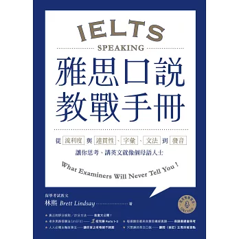 這本無價之寶――《雅思口說教戰手冊》包含許多答題示範,根據評分標準分析比較優劣答題範例。此外,多元應試策略點破考生常見的盲點。這本書是任何一位認真準備雅思考生的必備寶典,引領他們達到目標分數。
