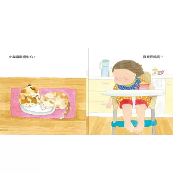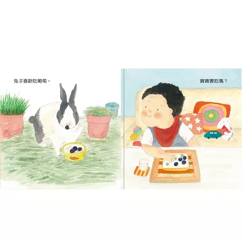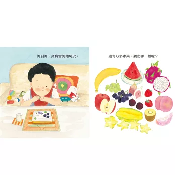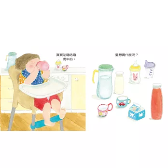 《寶寶喜歡吃》是一本專為0~3歲幼兒設計的翻翻書,書中出現的玉米、番茄、西瓜、香蕉、吐司,都是餐桌上常見的食物與蔬果。你可以透過「你想要喝牛奶還是果汁?」這樣的一問一答,或「這是湯匙、這是叉子。」等指物命名的方式,帶領孩子認識不同食物和餐具的名稱,在生活中練習用小湯匙吃飯、幫水果剝皮。