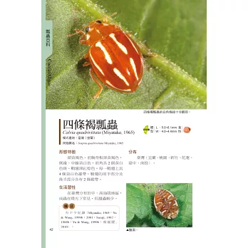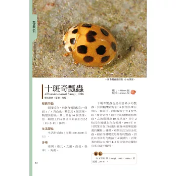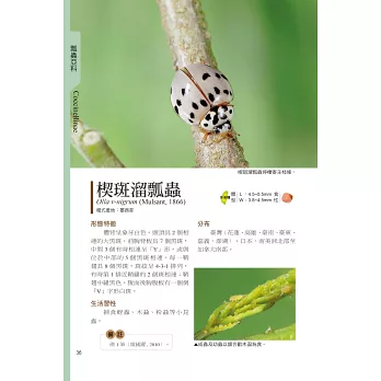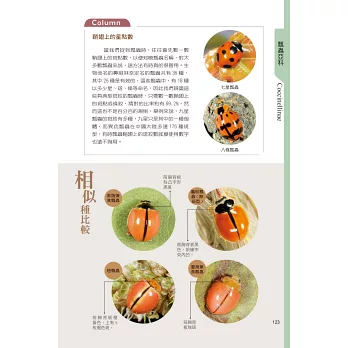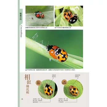 瓢蟲斑紋多變、不僅同種瓢蟲有多種變化外,有時不同種又有相近斑紋,透過本書的圖片比較,讓您輕鬆辨別其差異。