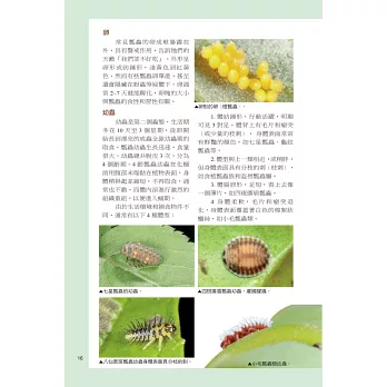當瓢蟲一遇到危險時,除了會將身體蜷縮起來裝死,有時還會分泌一種具有刺激性及臭味的黃色液體來驅逐敵人,透過本書的介紹,讓您清楚掌握模樣可愛的瓢蟲有哪些趣味的生態行為。