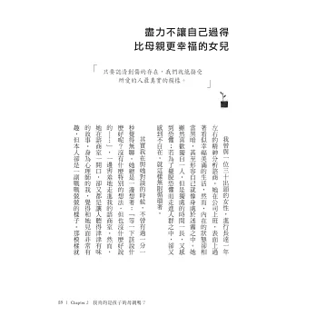 從這本書中,我更進一步的理解母親對待我的態度原因為何?背後隱藏著想表達的情緒是什麼?隨著書中文字的慢慢梳理,也許,解開了一部分多年來我對母親的糾結。希望這本書,能帶給不論是母親還是女兒的妳,或是同時兼具這兩個身分的妳,一些強大的勇氣與力量,檢視過去以及面對未來。