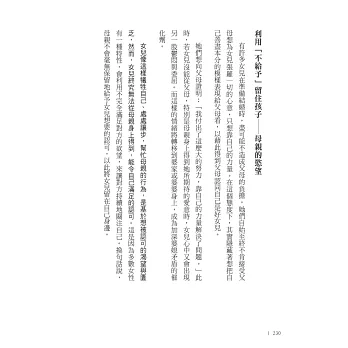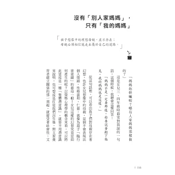 「母親必須回到女性,從女性回到個人,解決自己與原生家庭、婚姻的難題,才能更敏銳地察覺孩子的狀態。感謝這本書,讓我知道自己想成為的母親,是能作為孩子強而有力的心理肌肉,推動孩子進入下一段情感關係、下一個生命階段。」──諶淑婷 文字工作者