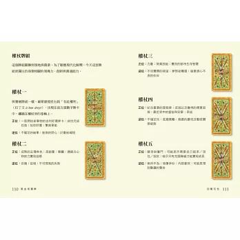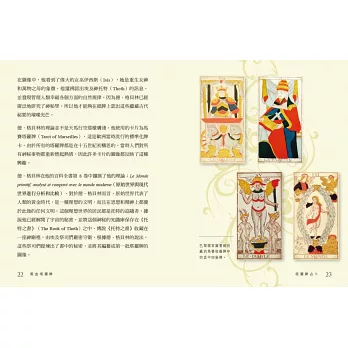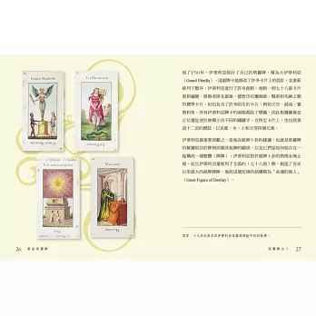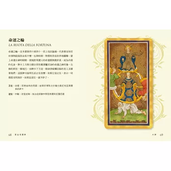 專業解說維斯康提塔羅的歷史源流以及思想演變,還比較了來自其他類型的牌組卡片;詳細解讀主牌繪面,包括場景、服飾與意象分析,以及正向與反向代表的不同意義,副牌等其他牌面也做了精細的解釋,更提供了由淺入深的占卜與卡片排列(牌陣)方法,帶您一步一步踏入維斯康提塔羅瑰麗又神祕的世界。