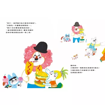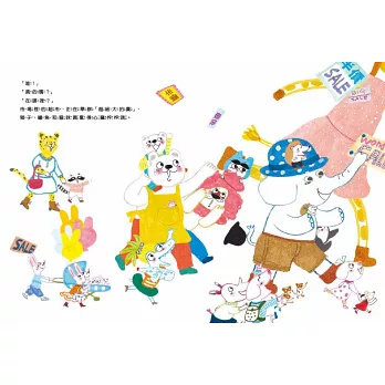 故事開頭,看著一頁又一頁繽紛熱鬧的畫面,讀者們會和主角們一起沉浸在購物的興奮感中,完全忘了一開始去市場的目的,只顧著享受大買特買的過癮滋味……畫面中琳瑯滿目的各式商品、商店裡各有特色的搶購路人,以及藏在各處的小彩蛋劇場 (找一找我們的主角們在哪裡?他們又都在做什麼事?),絕對可以滿足讀者閱讀上的視覺樂趣。