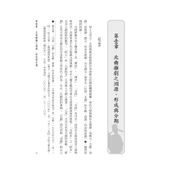 而理論既明,乃對蒙元雜劇藝術之成分逐次探討,從而敘其整個搬演過程。前者從其外在結構「體製規律」之淵源形成,劇場類型與劇團成員,腳色之穿關與妝扮,樂曲、樂器與科白,內在結構「排場」之處理等五單元敘論,以見北曲雜劇舞台藝術之橫剖面。後者從搬演前,搬演過程、收場與「打散」三部曲陳述,以見北劇搬演藝術之橫剖面。但由於其中「腳色」一項,至清代始發展完成,故略於此而合併於〔明清戲曲背景編〕論述。