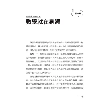 作者筆觸流暢生動,書中提及跟生活息息相關的例子,其背後都藏著數學的身影。當你使用谷歌地圖規劃行車路線,它正應用圖論的最短路徑演算法。當你開啟汽車的電腦巡航控制系統,它正使用微積分對於不斷變動的過程做計算。不時見到令人疑惑的民調數據,若你擁有機率統計的素養,就能嚴肅客觀的正確解讀。透過作者的旁徵博引,你會接受數學就在身邊,也會承認數學真的有用處。── 李信昌|數學網站「昌爸工作坊」站長