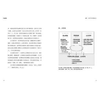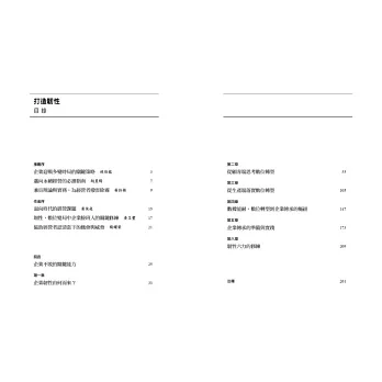 第一章將從較大的時間尺度,點出企業在各面向所面臨的挑戰,被動與能動這兩種韌性,又是扮演何種角色。第二、第三章則是對焦數位轉型課題,技術應用以外,還容易忽略哪些事,以及如何深化各種線上線下的、顧客端與生產端並存互換的概念,讓企業在轉型的過程中少走冤枉路。第四章則是將數位轉型的成敗從「事」連接「人」,而關鍵正是經營者的認知、眼界與企圖,接著銜接第五章有關企業傳承的準備與實踐。最後,作者提出「韌性六力」的模型,為企業在全覽力、連結力、穿越力、更新力、開創力、警醒力等六個面向提供具體作為,全面關照、護持、培養企業韌性。