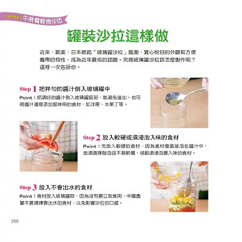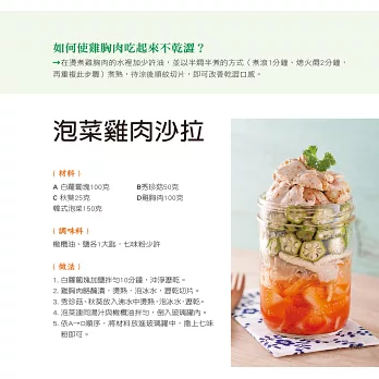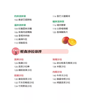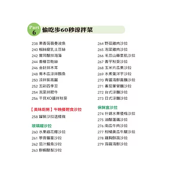 種類多元的食材只要稍稍加以變化,就能迅速拌出美味,短短60秒輕鬆上桌,書中我也為大家介紹了多道偷吃步料理,快速又方便,讓你在忙碌的生活裡,不必花太多時間,就能做出一道道美味又健康的涼拌料理。