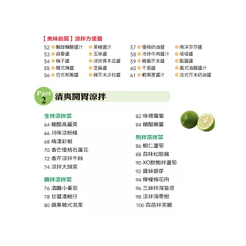 很多人以為涼拌菜不過就是用來餐前開胃,或是在等待主菜上桌之前打發時間的小菜。但本書中許多涼拌料理,卻有著主菜的精彩。從食材的挑選、醬料的製作、刀工及技法,處處可見作者的用心與細膩。