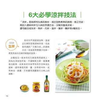 在本書中,我為大家列出了6大涼拌技法-生拌、醃拌、熟拌、灼拌、溫拌、嗆拌,深入淺出且容易上手,相信讀者們只要學會了,就可以為你的餐桌變化出更多美味的涼拌料理。