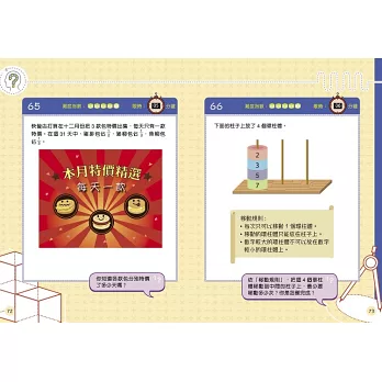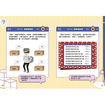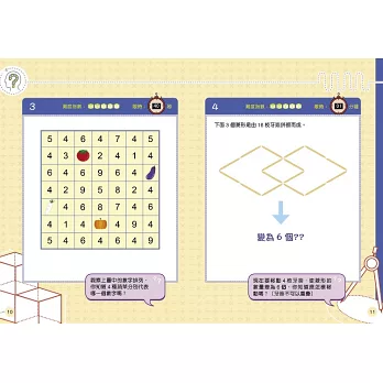 ▍本書包含了100道好玩有趣的數學謎題,題型多樣,每道數學謎題均設難度和限時,可讓孩子不斷嘗試,非常適合喜歡挑戰的孩子一起探索神奇的數學世界,發現數學的樂趣!