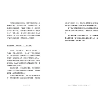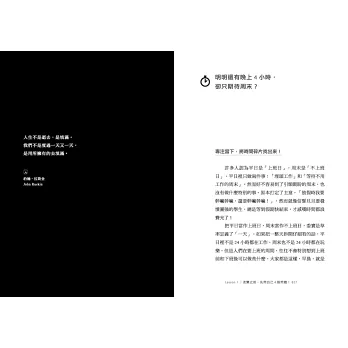 我決定不要把時間胡亂綁在一起,也不左顧右盼回顧時間,而是專注在每個當下,把細碎如原子的時間碎片找出來,再將每個當下串連起來。如果把平日裡的24小時拆開來看,在公司的時間包含休息,大概九個多小時,假設每天睡七小時,不工作的時間也還有八小時。扣掉通勤時間,每天至少有五到六小時是不工作的。當然還要扣掉處理雜七雜八事情的時間,最後每天至少還有三到四小時。這時間絕對不算短,起碼花在等待周末絕對是一種浪費。