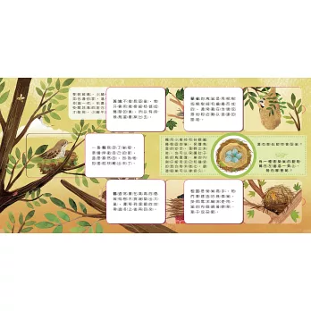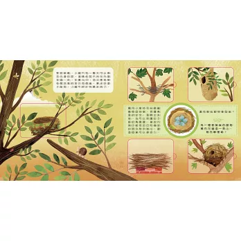 ★認識6種巢穴的形式:跟著小蝸牛參觀動物們的家,地洞、鳥巢、蜂窩、樹洞、隧道、石穴,共有六種不同形式的巢穴,動物們可是非常厲害的建築師喔!