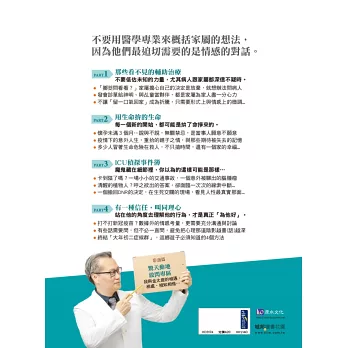你將看到阿金醫師用智慧化解家屬的糾結和爭執,並巧妙的在醫、護、病之間穿針引線、創造三贏。在生命不能圓滿的當下,至少每個過程都能圓融。
