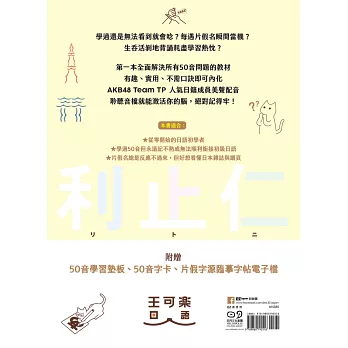 本書另外強調,對大多學習者而言,片假名不易熟習,然而吸收或傳達生活資訊時,特別在流行、娛樂、專業領域,片假名是關鍵字。本書附贈「漢字偏旁臨摹帖」電子檔,掃QRcode即可自由列印。透過臨摹片假名漢字源偏旁、及精心設計的「平片假轉換」習題,迅速熟習片假名,必能克服片假名只能跳過的缺憾!