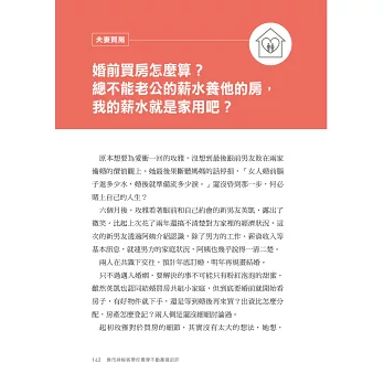 書中第四部中的一個故事主角「玫雅」,就碰到類似的人生困境。未婚夫辛苦工作攢錢買房,但房子登記卻在其他家人名下。應該當作沒看見,婚後再解決?還是,該在婚前把醜話講清楚,楚河漢界切乾淨?一旦「親兄弟明算帳」,會不會被烙印上「現實」的罵名?讓好不容易經營的愛情,產生永久難癒的疤痕?