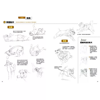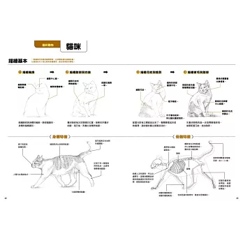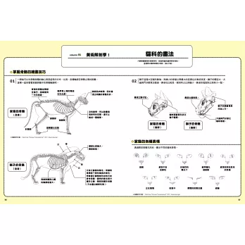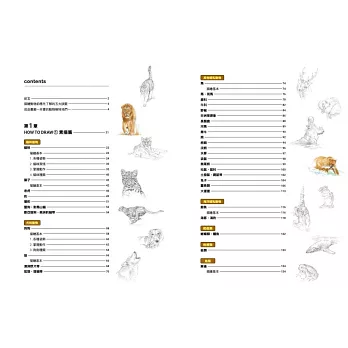 ◎依動物形態分門別類,區分「貓科」、「犬科」、「陸地哺乳類」、「海洋哺乳類」、「爬蟲類」、「兩棲類」與「鳥類」,詳實示範98種動物的畫法。