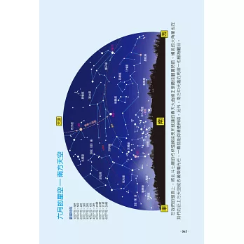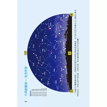 春去秋來盛暑寒冬,四季夜空中粉墨登場的星兒們也不同,《星座‧星空圖鑑》一書,依照春、夏、秋、冬四季的順序介紹星空中的星座,使我們能了解每個季節會有哪些星座升起,並以我們朝向南方或北方看星空的情境,以半圓圖形模擬南方天空或北方天空出現的星座,吸引讀者進入星空殿堂來認識星星,使圖鑑變成最簡單易懂的認星秘笈。
