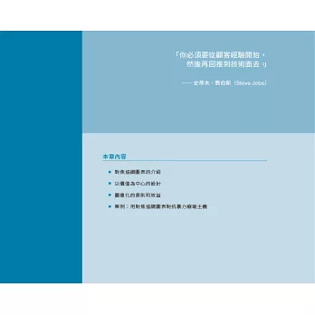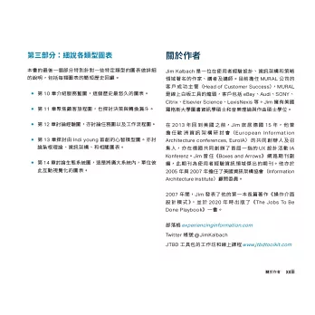 「Jim將圖表的優點具體化,釐清了流程,並提供了激發靈感的視覺範例,能幫助設計和商業領導人更願意為顧客提供更好的服務。」 — Kate Rutter,顧問、設計師、加州藝術學院互動設計教授