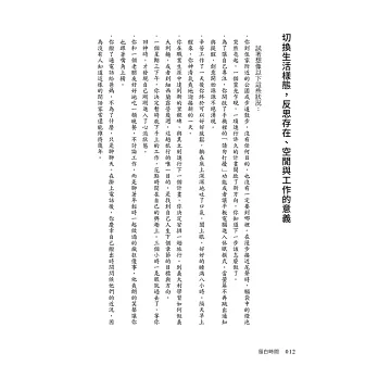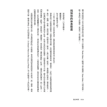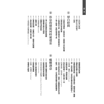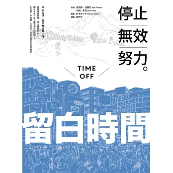 透過介紹各個領域的傑出人物,革新者、顛覆傳統的人物、諾貝爾獎得主、思想領袖、億萬富豪、作品豐富的藝術家,甚至是希臘神話人物,還有就住在隔壁的鄰居。他們都透過各種嶄新的習慣、思維模式、實際能夠應用在生活中的原則等來練習「留白時間」。你會發現許多成功人士並不是以過勞和倦怠為代價來換取成就,而是因為「留白時間」大大提升了他們的工作品質。