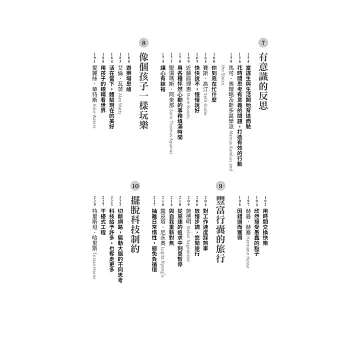以故事串聯故事,循序漸進切入學習、職場、創意、獨處、運動及反思等面向,於趣味處幽默消遣、重要處警醒提點,羅列落實練習,有意識的訓練自我,在忙亂生活重新找回重心學會留白,改變僵化例行的思考與行為,讓你找回工作、生活與自己的聯繫。