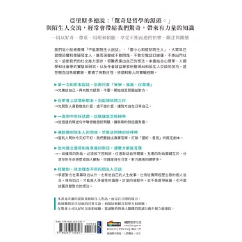 我們從小就被教導「不能跟陌生人說話」、「要小心和提防陌生人」,大眾早已習慣恐懼和懷疑陌生人,進而演變成不敢問路、不敢打電話訂披薩、不想出門社交。這使我們的社交能力退步,很難表達出自己的想法。本書結合心理學、人類學和社會學的實驗與研究,以及作者請益專家所整理出和陌生人交談的技巧,甚至親自出馬做實驗,累積了無數古怪、詼諧和動人的實戰經驗。