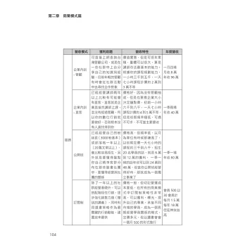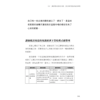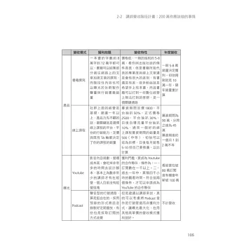 ***書中利用多個表格剖析「講師職涯商業模式」、「專業課程規劃流程」,幫助想要成為成功職業講師的你可以不斷實作演練: